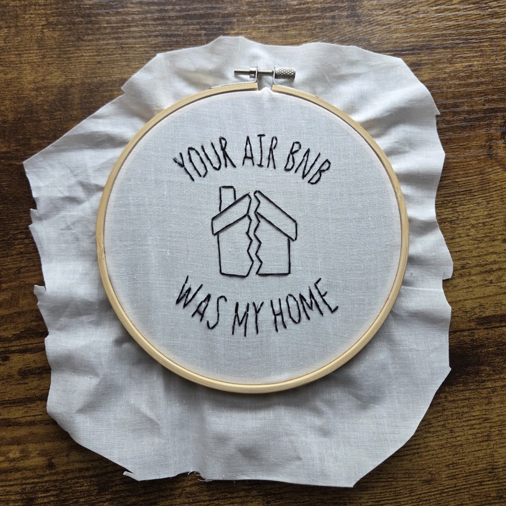 I recently completed an embroidery piece that reads “your Airbnb was my home”, beside an image of a house broken in two. It’s a quiet act of craft, but its message is urgent: in Ireland, homes are being taken away from people and converted into commodities. Children, families, and emigrants are living with the consequences.