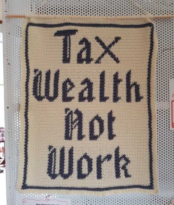 Through my craftivism, I’ve already been trying to do that. Projects like Tax Wealth Not Work, Your Airbnb Was My Home, and Trans Rights Are Human Rights were all ways of stitching stories — using thread and fabric to say something that words alone couldn’t.